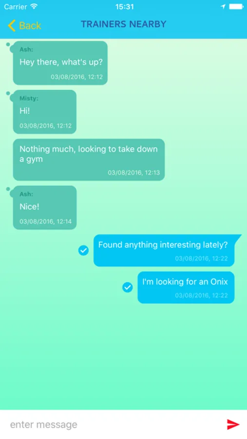 GoMessenger is extremely easy to use. Choose your team (yellow, blue or red), select region and chat in a group conversation with anyone in 40 km (25 miles) range. You can choose between two chatrooms: one is for all trainers in the area and second shows only nearby players from your team.