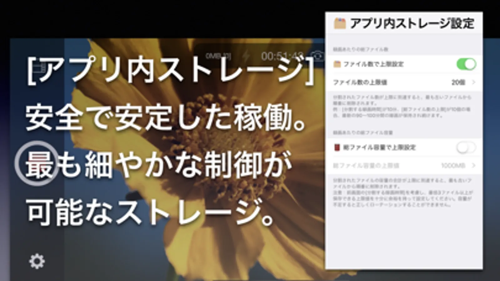 - 録画中の思わぬアクシデントによる録画の緊急停止を想定し、事前に指定したお好みの録画時間にてファイルを分割保存しながら録画します。