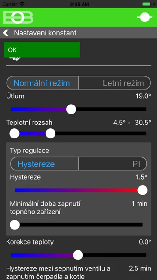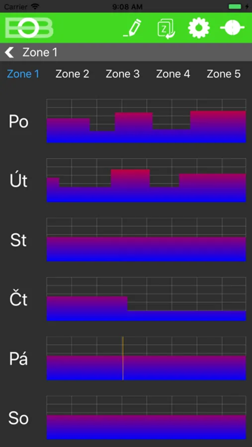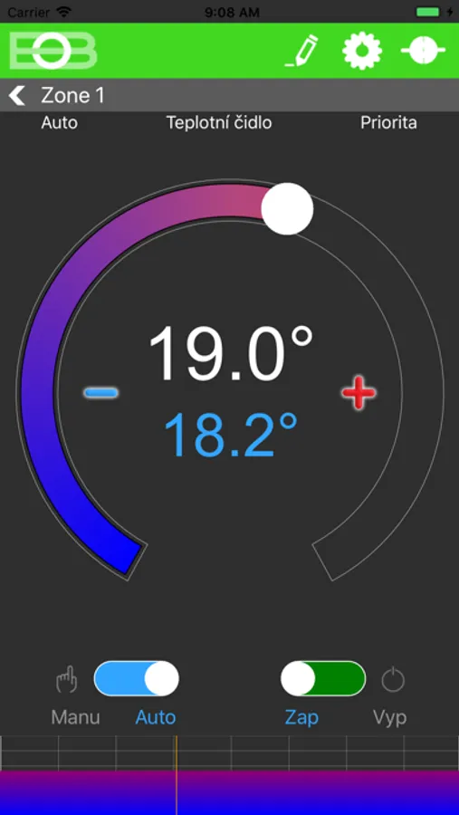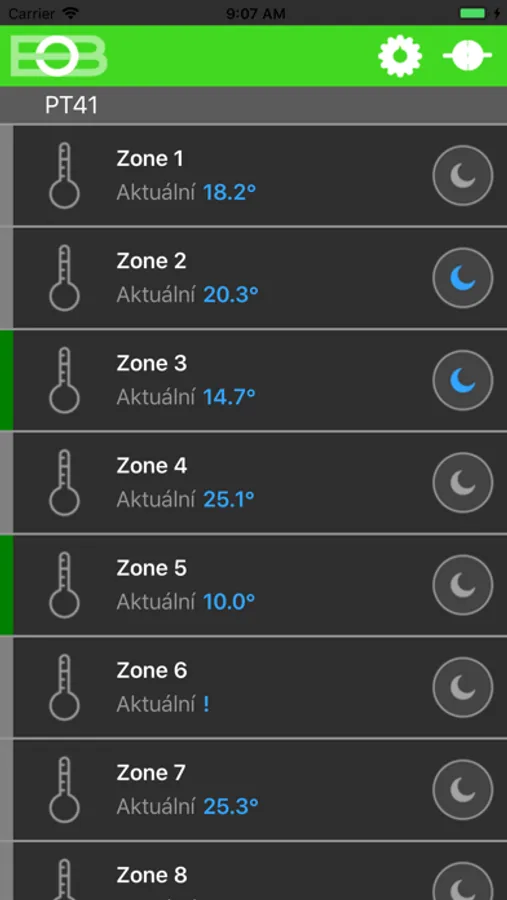 Aplikací PT41 získáte dohled nad všemi topnými zónami vašeho objektu. V detailu zóny uvidíte aktuální i nastavené hodnoty včetně teplotních programů, které si můžete přizpůsobit dle Vašich požadavků.