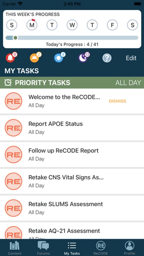 - View your daily and weekly adherence to your protocol tasks as well as a history of your progress.