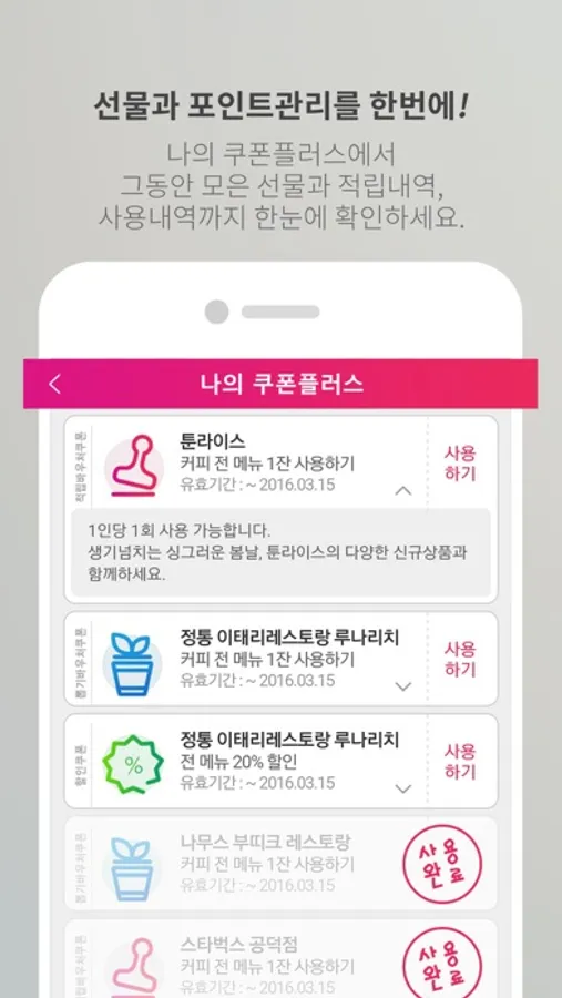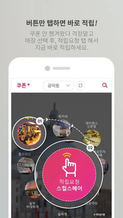 매장에서 쿠폰 적립시, 매장 아이콘 선택하고 한번만 누르면 적립 끝!