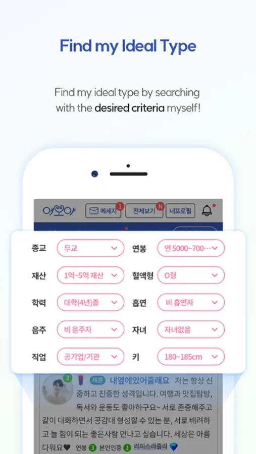 On Yeoboya, you can search for your ideal partner based on age, location, education, salary, religion, and more.