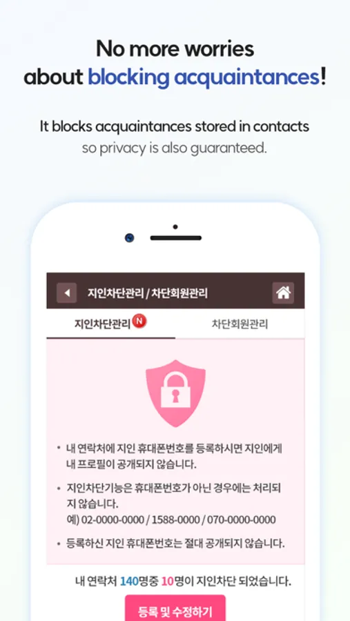 Are you worried about meeting someone you know or an acquaintance on Yeoboya? Then try using the acquaintance blocking feature! Simply register the phone number of your acquaintance in your contact list and your profile will not be disclosed to them..