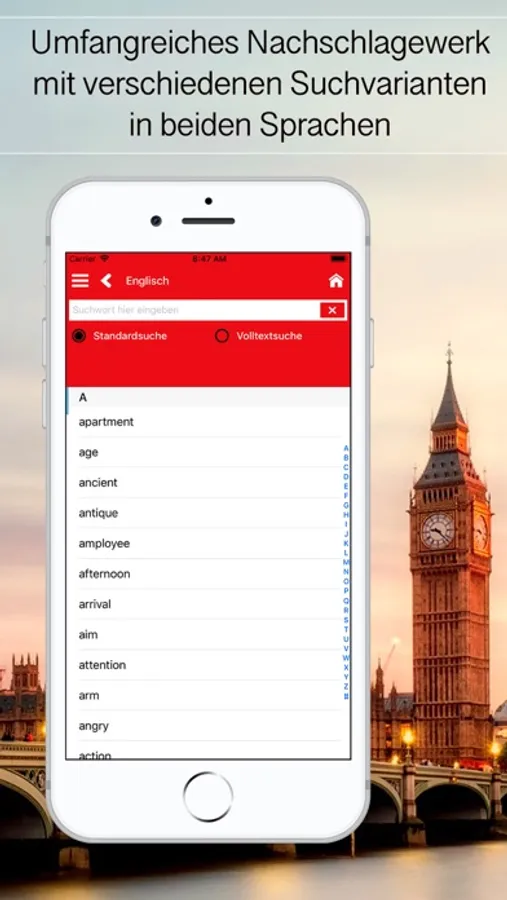 Mit dem Vokabeltrainer Deutsch-Englisch erlernen Sie den Grund- und Aufbauwortschatz der englischen Sprache. Dieses Lernprogramm deckt die meisten Bereiche der englischen Alltagssprache, wie beispielsweise die Themen Reisen, Unterhaltung, Kommunikation, Sport & Spiel, etc.