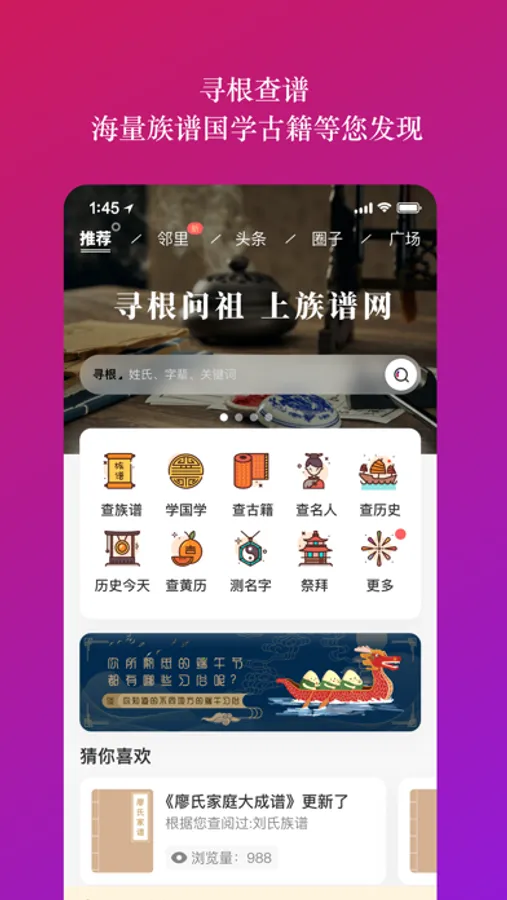 轻松翻阅查询百家姓氏族谱、家谱书寻根问祖,实时与亲友聊天,随时发布日记,相册,记录家庭亲情故事,制作家庭画册、与学迷畅谈古今,了解圣贤事迹,弘扬优秀传统文化。我们定位打造人类族谱大数据,以族谱、家族历史、中华百家姓氏、家族文化、历史为本源,致力于打造的对用户最专业且有参考价值的平台信息。