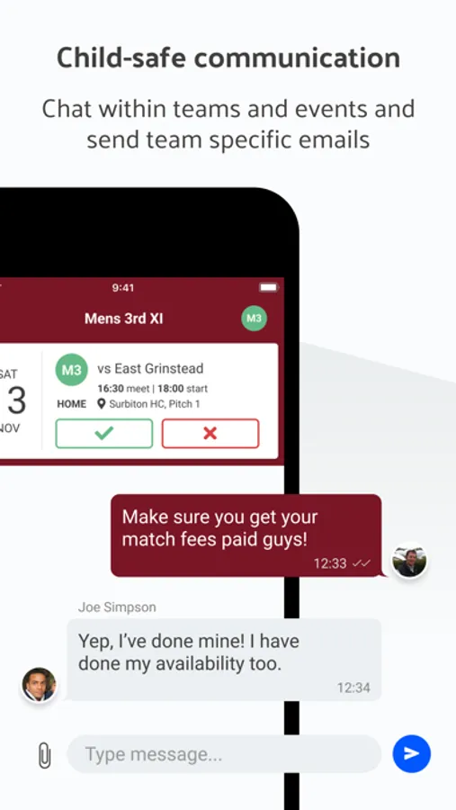 Guardians are included in all communications between an adult and a minor, and have full access to their U18s schedule. With emergency contact details in your pocket, parents have peace of mind that travelling managers can access medical and emergency contact details pitch side.