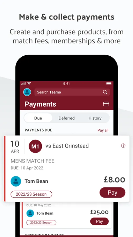 Collect and track team payments (subs, tickets, match fees) with easy in-app one tap card payments.
