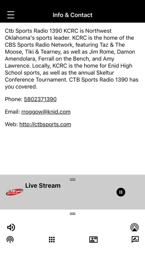 Ctb Sports Radio 1390 KCRC is Northwest Oklahoma's sports leader. KCRC is the home of the CBS Sports Radio Network, featuring Taz & The Moose, Tiki & Tearney, as well as Jim Rome, Damon Amendolara, Ferrall on the Bench, and Amy Lawrence. Locally, KCRC is the home for Enid High School sports, as well as the annual Skeltur Conference Tournament. CTB Sports Radio 1390 has you covered.