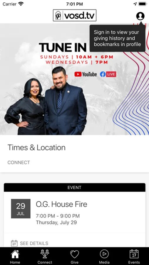 Connect and engage with the VOSD app! You will be able to view upcoming events, give, read the bible, and more!