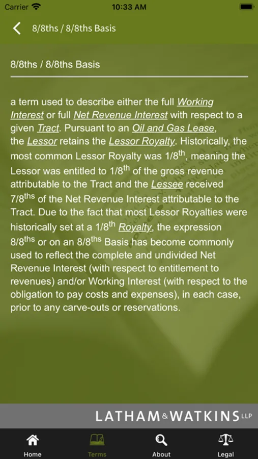 The Book of Jargon® – Oil & Gas is one of a series of practice area-specific glossaries published by Latham & Watkins. The definitions contained in The Book of Jargon® are designed to provide an introduction to the applicable terms often encountered in the oil & gas industry. These terms raise complex legal issues on which specific legal advice will be required. The terms are also subject to change as applicable laws and customary practice evolve.