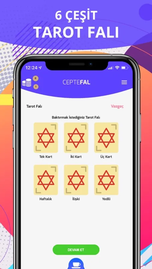 Tarot Falı • 7 Farklı tarot falı açılımını FalBurada mobil uygulaması üzerinden baktırıp fal açılımını ayrıntılı olarak okuyabilirsin. Tarot falı açılım türlerimiz ise şu şekilde: Haftalık tarot falı, İlişki tarot falı, Yedili tarot falı, Tek tarot falı, İki kart tarot falı, Üç kart tarot falı.