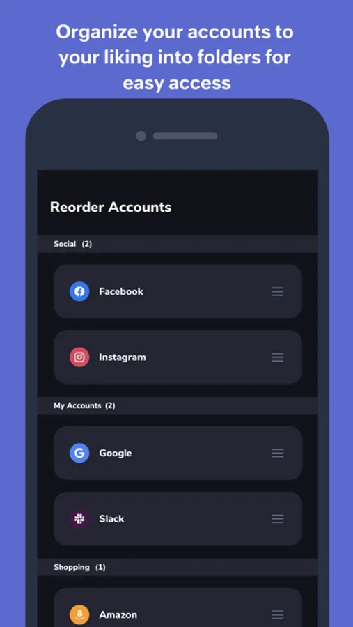 - CREATE FOLDERS to organize your TFA accounts to your convenience. You can create and reorder personal and work folders separately for easy access. You can also move accounts within and in between folders.