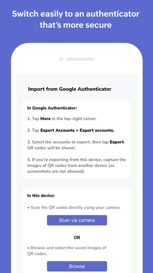 - Users can also MIGRATE their existing online accounts to OneAuth easily from Google Authenticator.