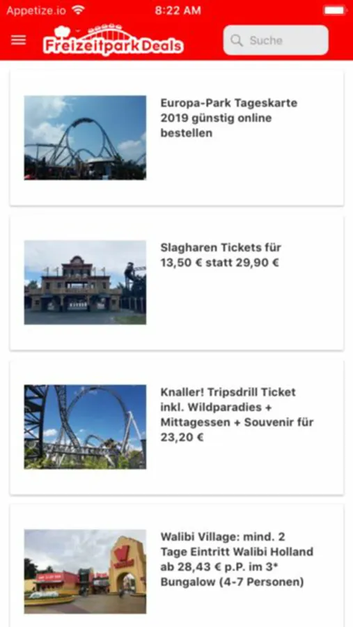 Du möchtest beim nächsten Freizeitparkbesuch bares Geld sparen? Dann lade Dir schnell die FreizeitparkDeals-App herunter und verpasse kein Schnäppchen. Egal ob Du nur ein günstiges Ticket oder direkt ein Angebot mit Übernachtung suchst - wir durchforsten das Netz nach den besten Freizeitparkangeboten für Dich. So sparst du bis zu 60 % gegenüber den Normalpreisen! Wenn du möchtest, informieren wir Dich auch per Push-Nachricht, sobald es ein neues Angebot gibt. Und als wäre das noch nicht genug, haben wir ab und zu exklusive Gewinnspiele für unsere App-Nutzer!