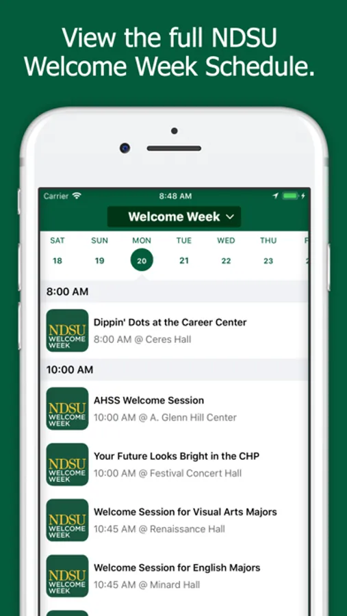 Stay in the know with everything that is happening for Welcome Week 2018! The Welcome Week app will serve as your schedule for Welcome Week and help to ensure that you start off on the right foot at NDSU. You'll be able to view the full schedule, add events to your personal schedule, and stay up-to-date with live updates and notifications.