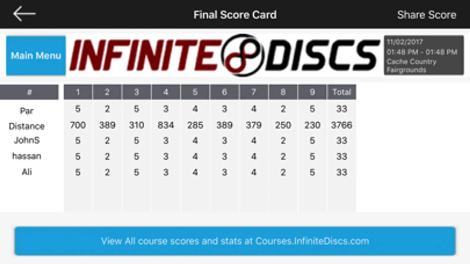 The Infinite Disc Golf IOS app allows you to keep score during your round and quickly upload all your disc golf scores to http://DiscGolfCourses.com and your InfiniteDiscs.com profile.