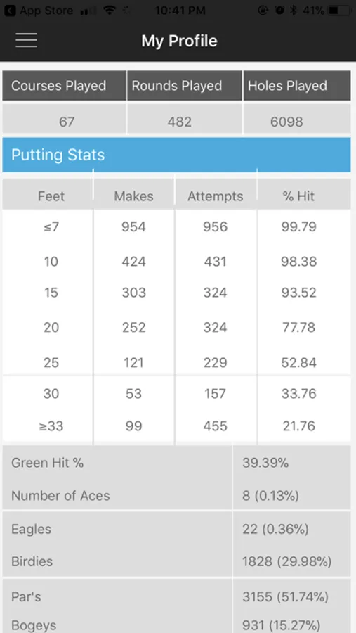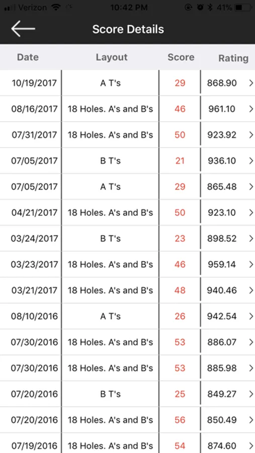 Build your Infinite Rating (similar to the PDGA rating) every time you play a round on a rated course. You can also track putting and penalty stroke stats to help you figure out how to best improve your game.