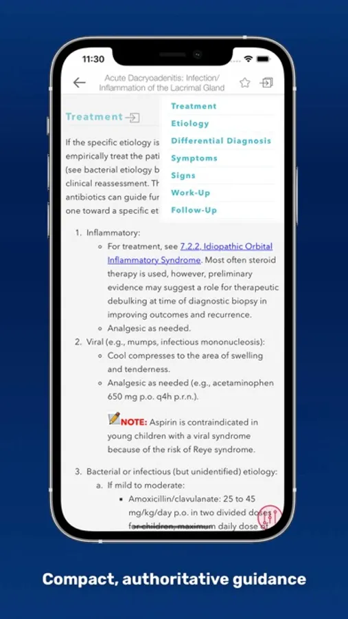 * A breakdown of conditions and diseases with sections on symptoms, signs, predisposing conditions, differential diagnosis, etiology, workup, treatment, and follow-up