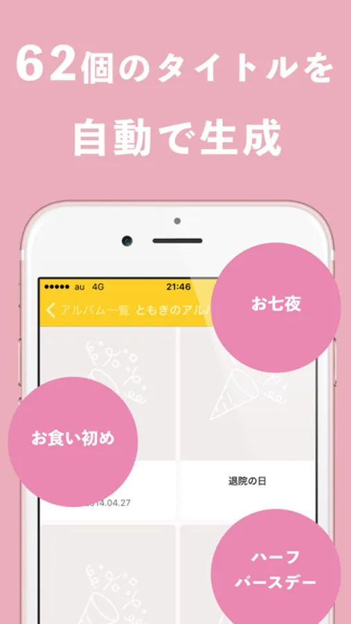 最初に赤ちゃんの名前や誕生日を入力すると、1歳までに行う行事やイベントと日付が入ったアルバムが自動的に作成されます。