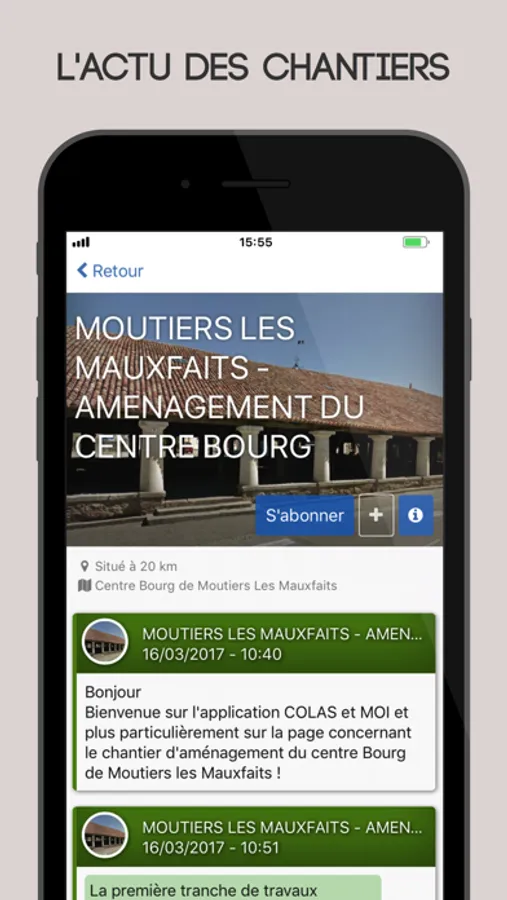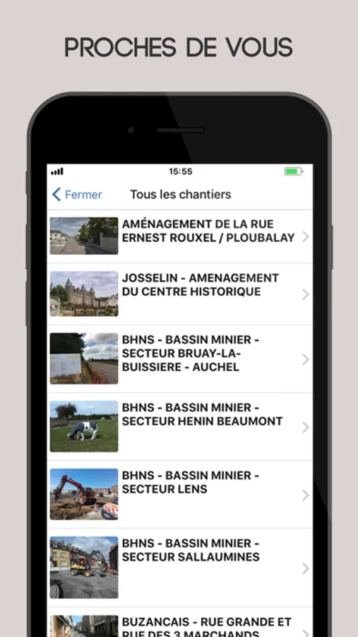 Retrouvez les chantiers proches de vous et utilisez l'application pour consulter les actualités et les informations des chantiers en cours.