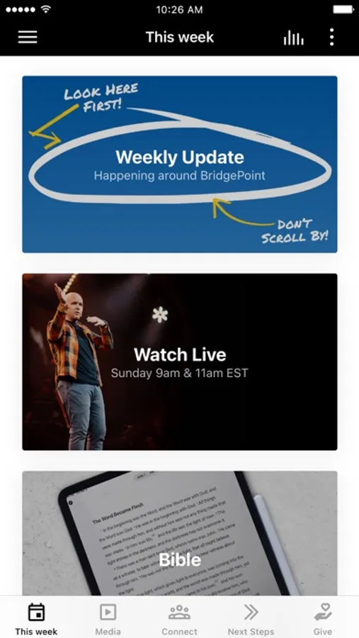 Use the app on Sundays during services to fill out online Connect Cards, submit prayer requests, give online, take notes on the message, and much more.
