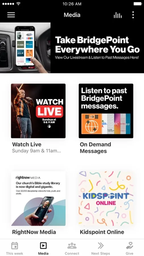BridgePoint's app gives you direct access to BridgePoint Church's most valued resources. You can watch live and archived messages, read articles from our staff, stay up to date on what's going on around here, and find out the latest way to connect in community.