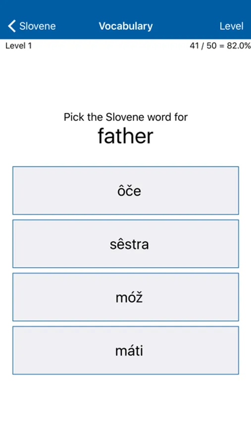 • Vocabulary: 148 levels, each testing the meanings of ten Slovene words. Interspersed among these are cumulative levels reviewing what has been learned earlier (giving a total of 167 levels).