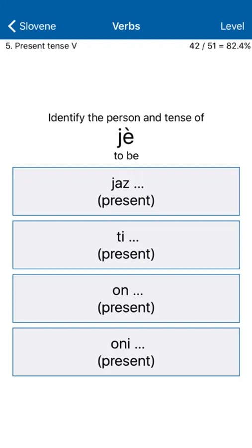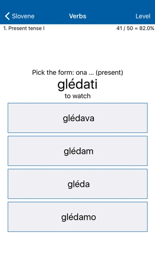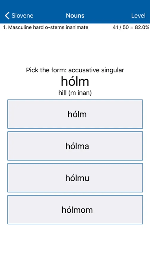Wherever you have your phone and a free moment, it offers a continuous multiple-choice test on Slovene vocabulary, the declension of nouns, and the conjugation of verbs. Each answer you give is immediately confirmed or corrected, and your knowledge is reinforced by repetition.