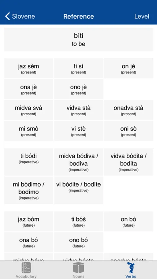 • Verbs: Tests your ability to parse and to conjugate a range of representative Slovene verbs.