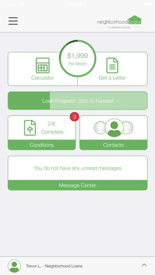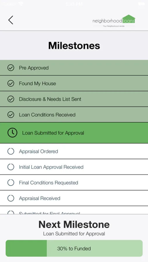 The Neighborhood Loans app allows all 3 parties (home buyer, loan officer, real estate agent) to track the progress of the home loan application process as the Home Buyer meets the milestones and conditions required to get final approval.