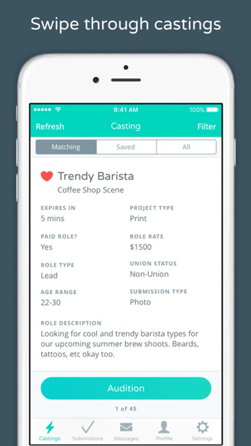 SWIPE - Swipe through roles that match you. Either submit on the spot or save the audition for later.
