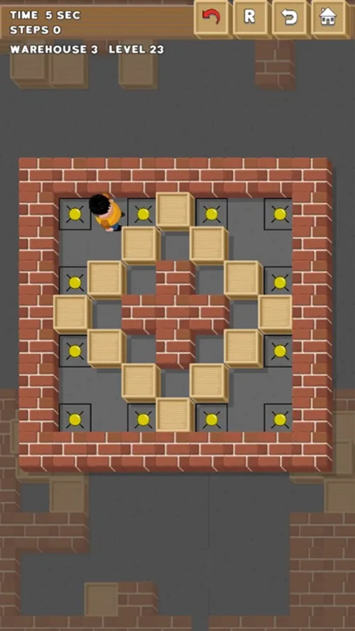 The player is confined to the board, and may move horizontally or vertically onto empty squares (never through walls or boxes). The player can also move into a box, which pushes it into the square beyond. Boxes may not be pushed into other boxes or walls, and they cannot be pulled. The puzzle is solved when all boxes are at storage locations.