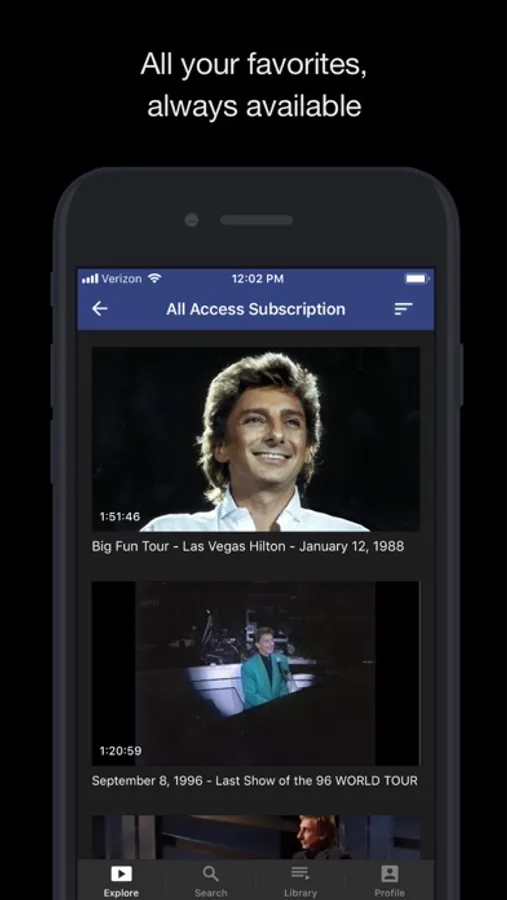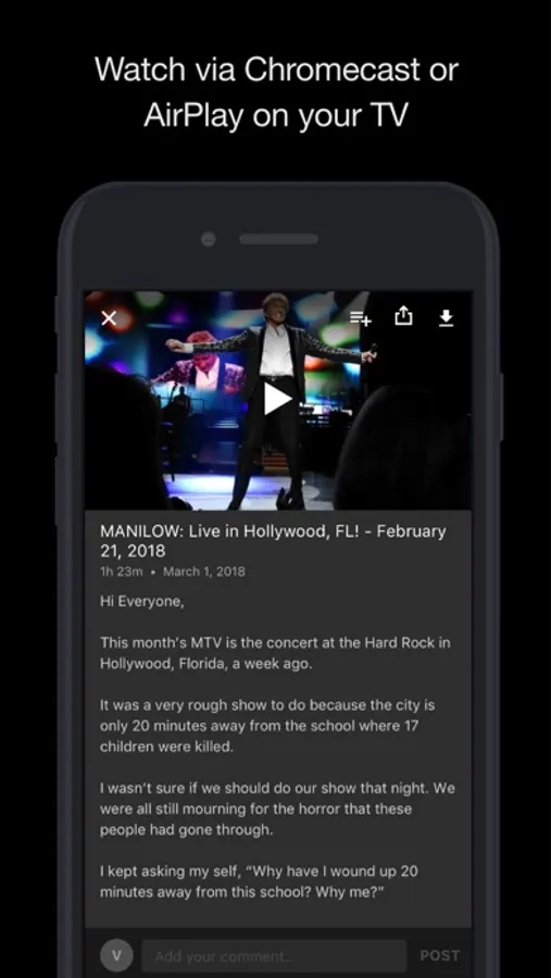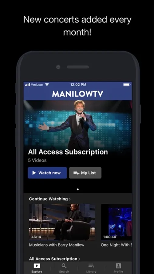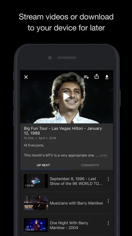 To access all features and content you can subscribe to ManilowTV on a monthly or yearly basis with an auto-renewing subscription right inside the app.* Pricing can vary by region and will be confirmed before purchase in the app. In app subscriptions will automatically renew at the end of their cycle.