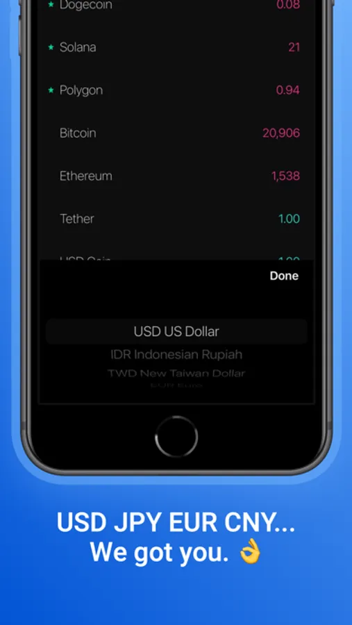 The app supports a variety of fiats, including USD, EUR, JPY, CNY, and more.