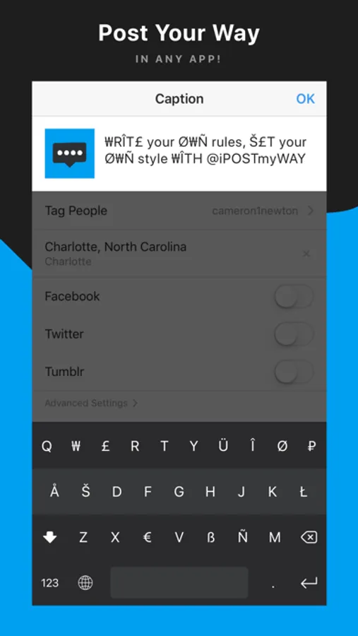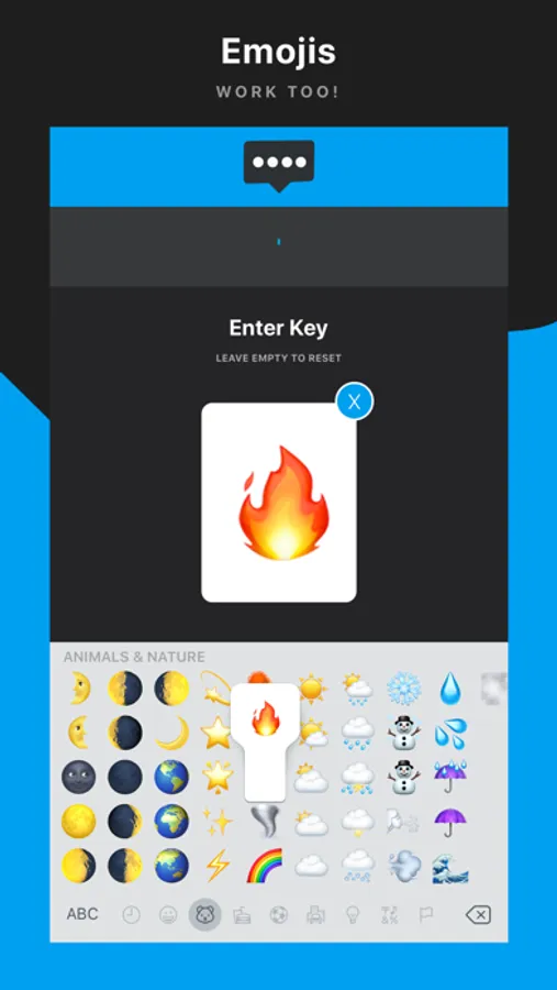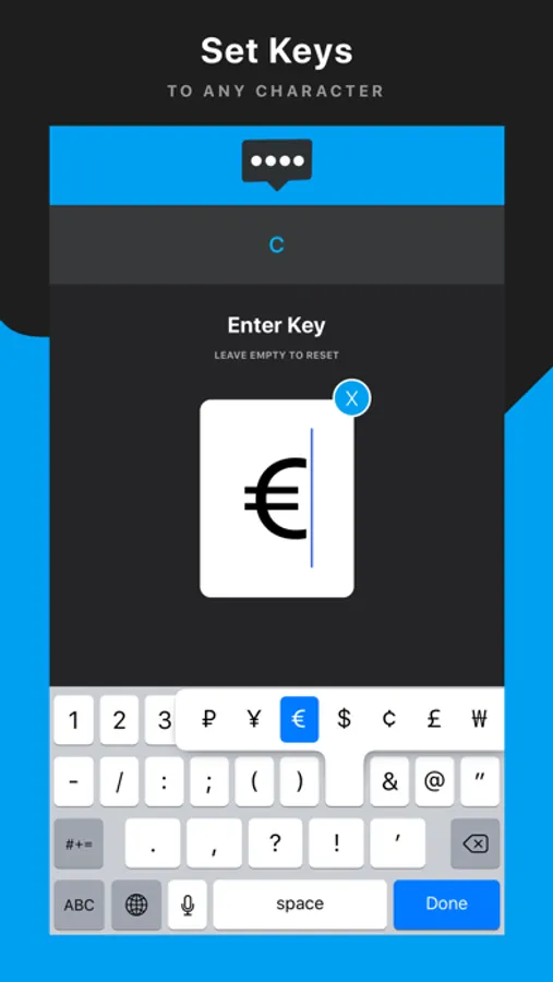 Setup each key on the keyboard to any character or emoji you want. No more searching for hidden characters or toggling through keyboard menus to find the right fit.