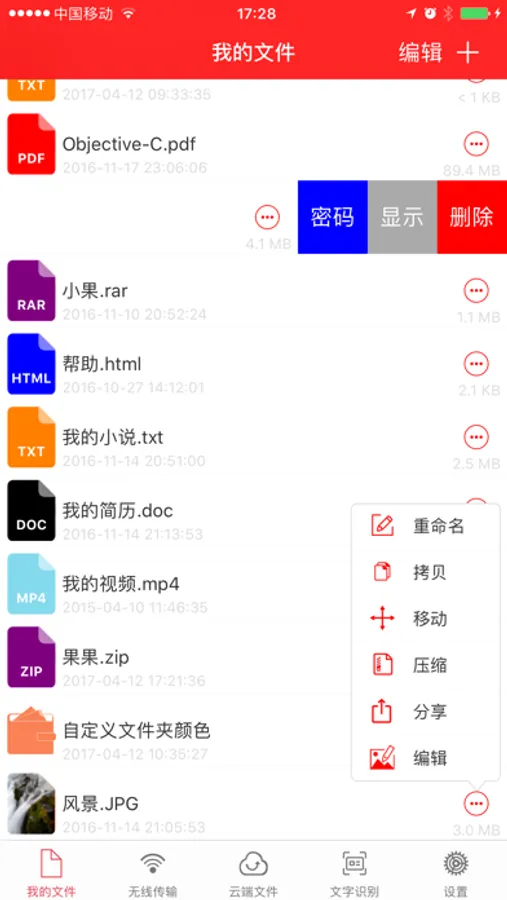 支持打开的文件类型包括:图片、视频、文档、网页、压缩包(zip,rar,7z)、文件夹等。