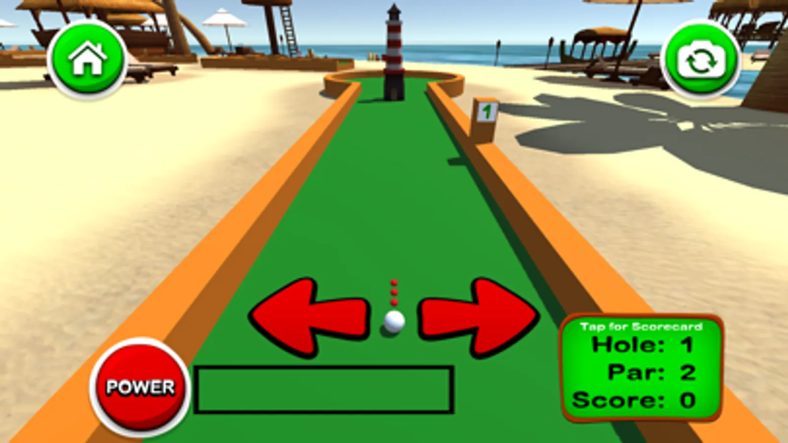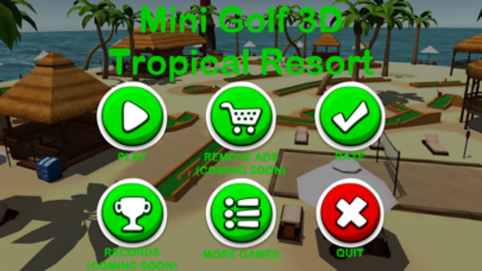 Mini Golf 3D Tropical Resort is a free mini golf game that includes 18 holes of varying difficulty with a simple to use interface and great 3D graphics that takes place on a relaxing tropical island. Mini Golf 3D Tropical Resort features normal mode and a practice mode where you can select an individual hole to practice as much as you want. There are also 3 different camera modes to cycle through including a behind-the-ball view, aerial view, and another view that continuously rotates around the hole. If you enjoy mini golf, you'll love this relaxing, yet challenging mini golf game. See if you can set the high score and become the mini golf champion!