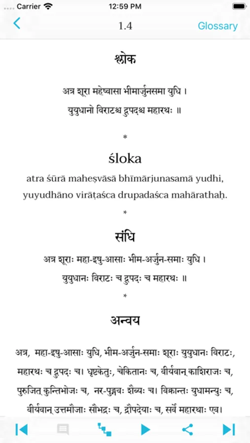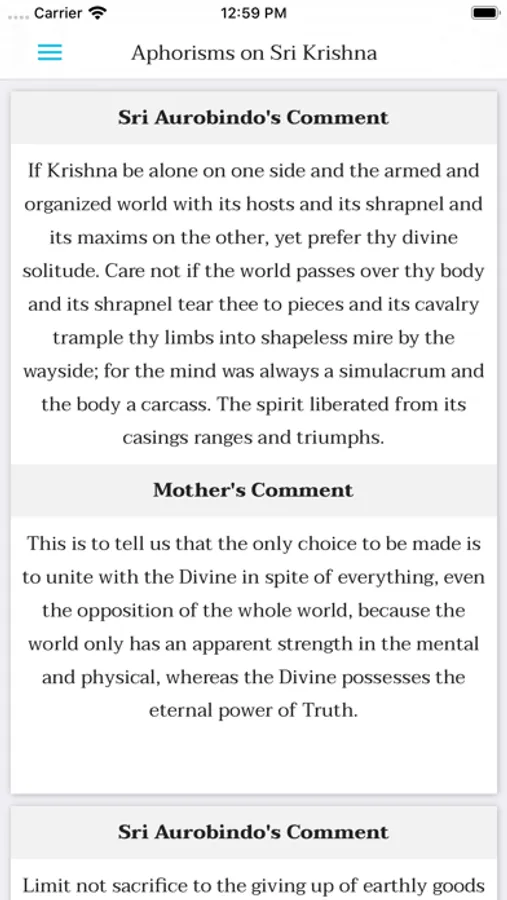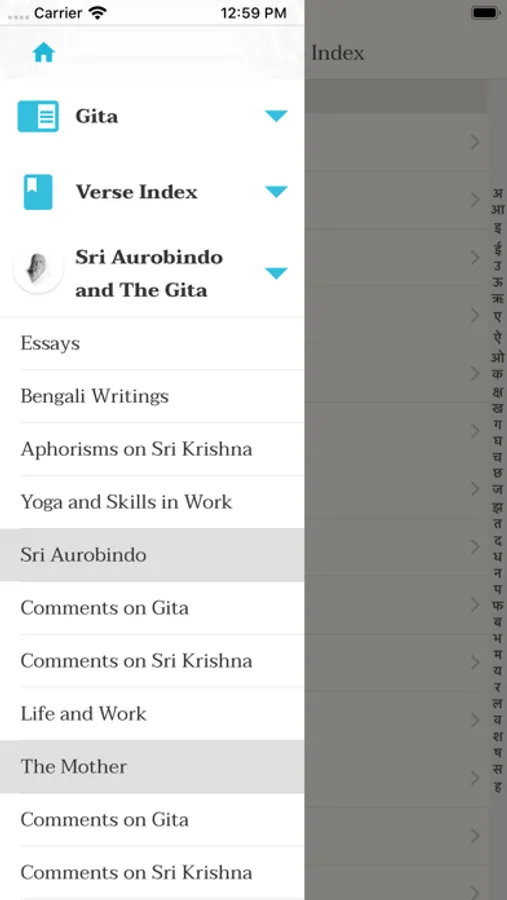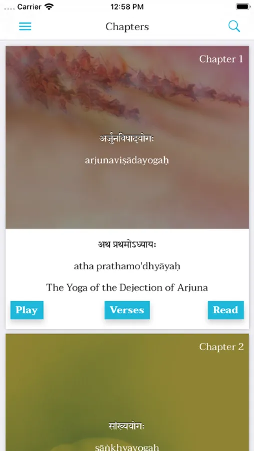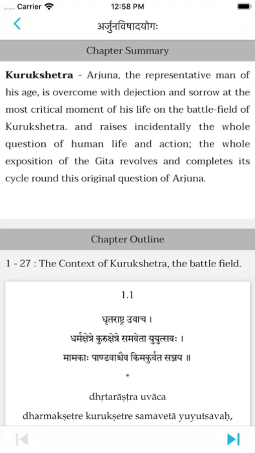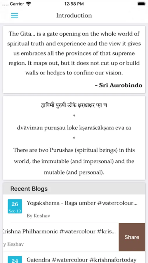 The Apps contains a veriety of material, presented in a manner which is easily accessible: the entire 700 verses of the Bhagavad Gita chapters are in Devanagari with a Roman transliteration, followed by an English translation, (ANVAYA the prose order of the Sanskrit words) and word by word meaning. Each verse has been traditionally chanted to illustrate the sound and beauty of the Sanskrit language. In addition, miscellaneous writings and extensively interlinked indexes give much to the scholar to work with. These includes a Quarter-verse Index, a Subject Index, and a Word Index which lists all the words in the Bhagavad Gita alphabetically along with their grammatical analysis. Hundreds of visuals have been used to give each page its own mood and atmosphere, at times bordering on the sublime. Last but certain not the least, it contains the entire text of Sri Aurobindo’s ‘Essays on the Bhagavad Gita ’. You can also understand Bhagavad Gita in English. Bhagavad Gita essays in english has also been provided.
