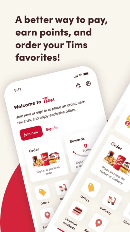 Meet the new Tim Hortons app—now easier to use with a new look and feel. Enjoy the convenience of ordering ahead for pickup, delivery, or dining in. Pay for your order and earn Tims Rewards Points in one simple step using Scan & Pay. With the app, you get access to personalized offers, delicious rewards, contests, and games—all through your phone!