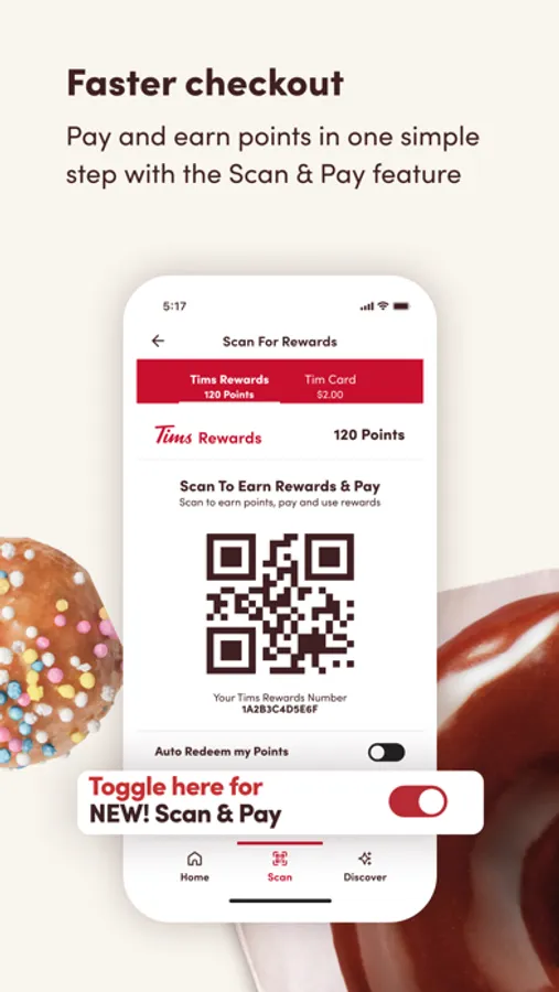 Save time at checkout with Scan & Pay. You can now pay for your order and earn Tims Rewards Points with one simple scan of your app.