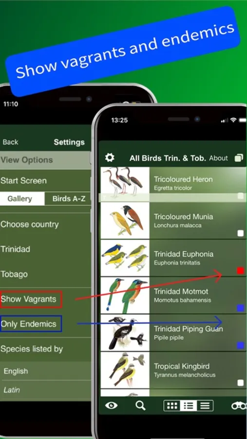 - Sort and display species: A–Z, 6 different languages, taxonomic listing