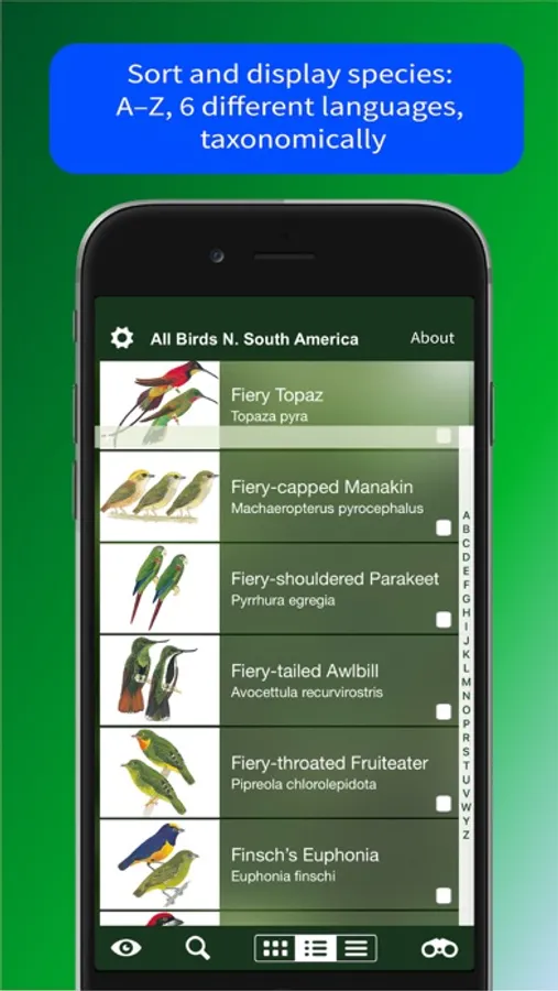 - Sort and display species: A–Z, 6 different languages, taxonomically