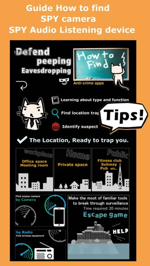 This apps provided information to find voyeur camera and wiretap equipment in the Place of hidden.