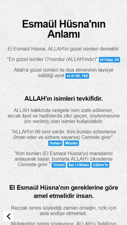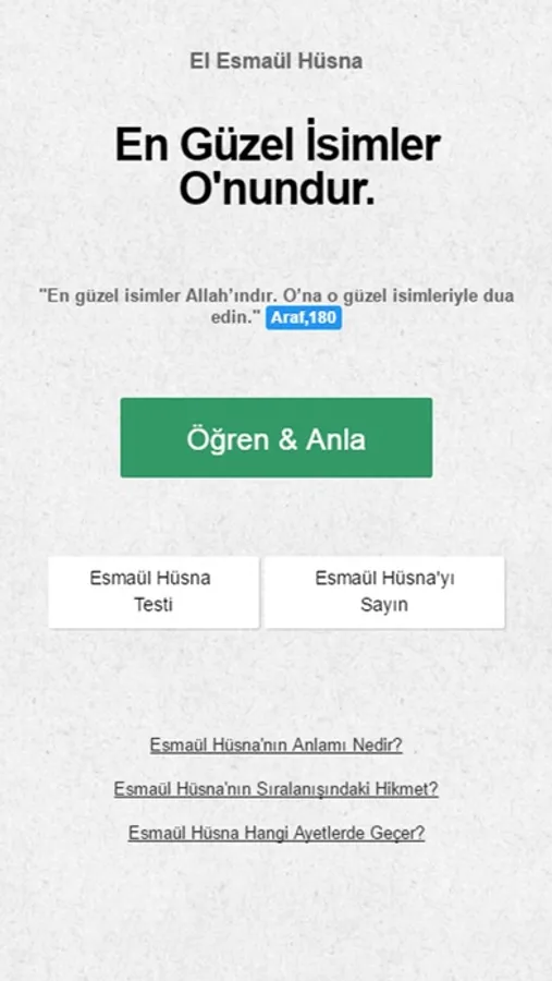 El Esmaül Hüsna uygulaması, Allah'ın en güzel isimleri olan 99 isminin daha kolay ve daha iyi öğrenilmesine ve anlaşılmasına yardımcı olması için hazırlanmıştır. En Güzel İsimler Allah'ındır. O’na o güzel isimleriyle dua edin. Araf,180.