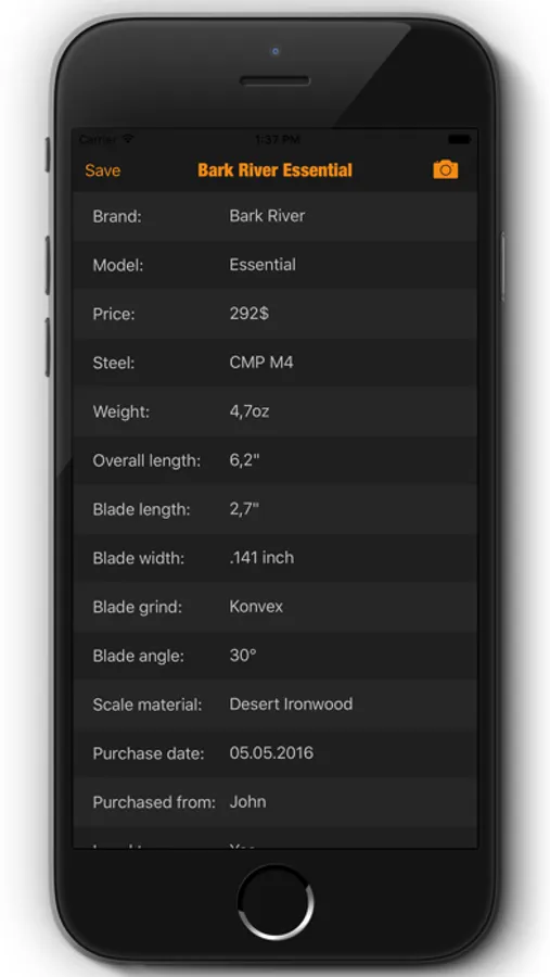 Add new knives with your own pictures and notes including details such as: