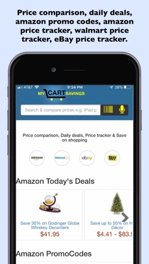 MyCartSavings helps with price comparison, save up to 80% using amazon promo codes, gives daily deals, amazon price tracker, walmart price tracker, eBay price tracker, price history, barcode scanner & amazon coupons and save on your shopping. It's FREE app that compare online real time prices of Amazon, Walmart , eBay & Best Buy and helps to "Shop" those items from retailer. It also do price comparison using your voice, barcode scanner & gives daily deals from Amazon, Walmart, eBay, Best Buy, Macy's, Target, GameStop, Loft, JCPenney, AliExpress, Fossil & Men's warehouse. And also track prices and gives email notification & notifications on your phone when prices goes below expected price. Black Friday 2021, Black Friday 2021 deals and Cyber Monday 2021 deals.