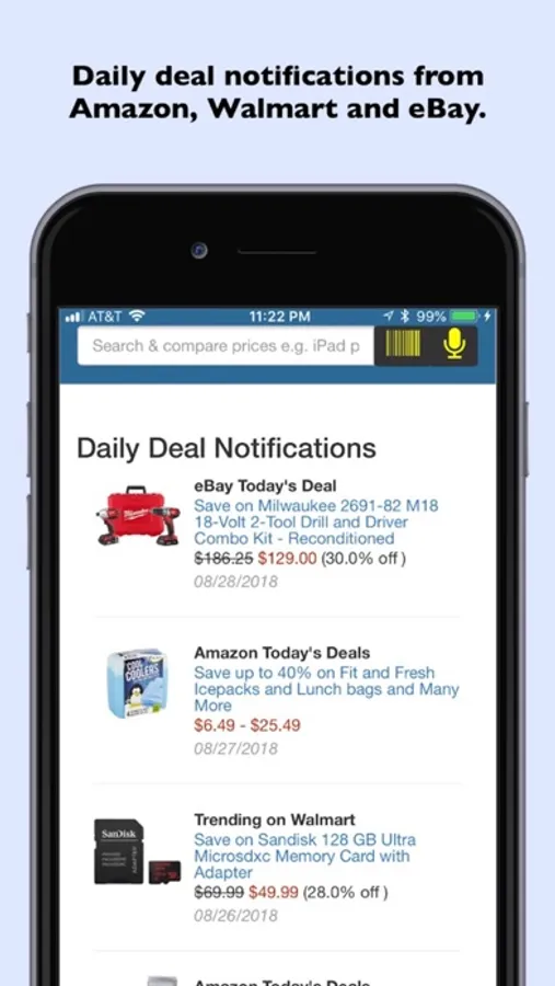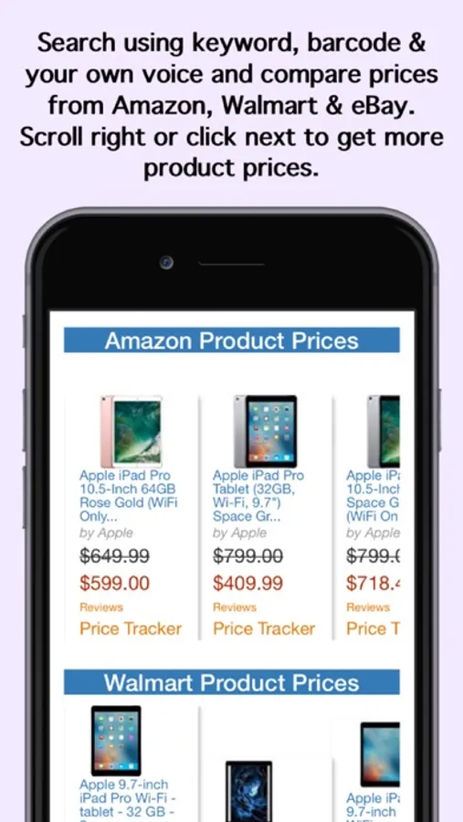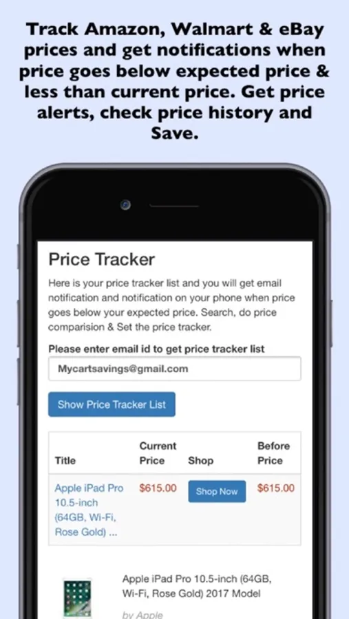This app helps to do Amazon price tracker, Walmart price tracker, eBay price tracker and gives email notification and notifications on your phone when price goes below your expected price. While doing comparison, click on "Price Tracker" and set your expected price. We will track prices and gives email and push notifications.