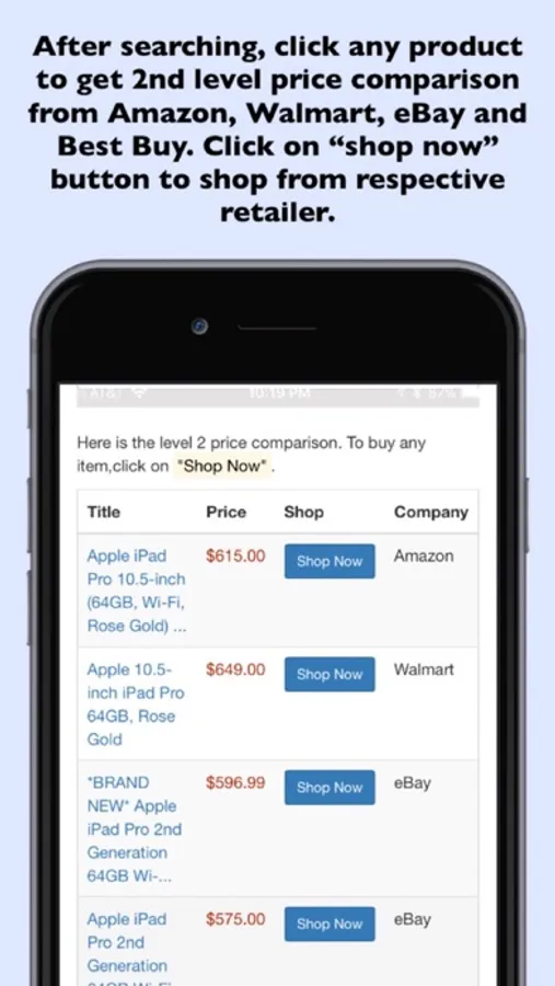 1) Enter the particular item name you want to shop e.g. iPad Pro. It will give the search results along with prices from Amazon, Walmart, eBay where you can do price comparison at level1.