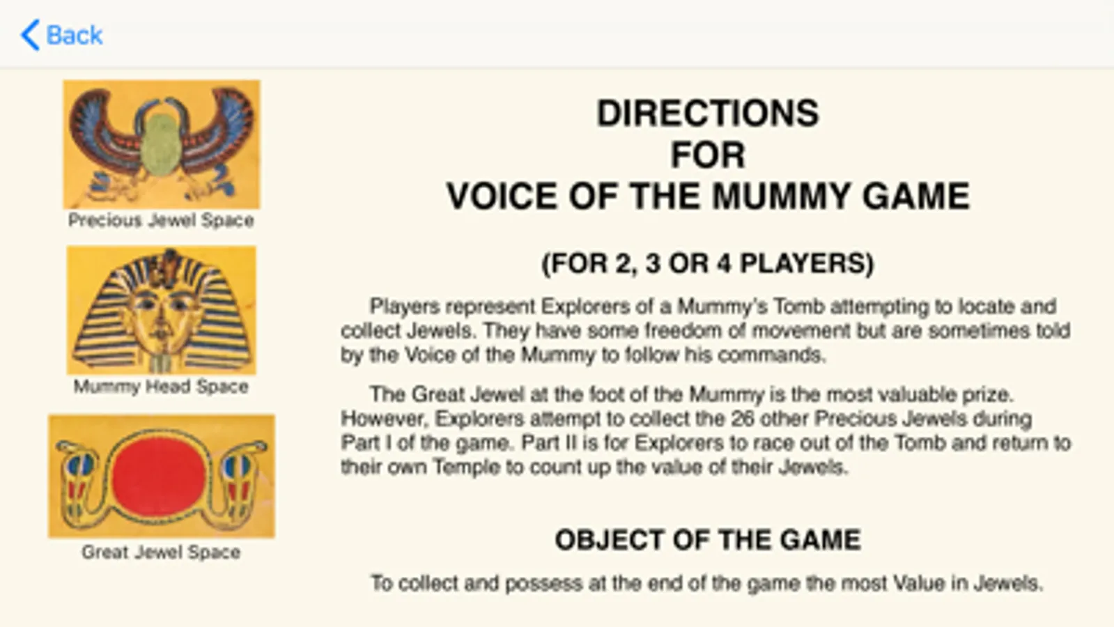 TO PLAY the Voice of the Mummy game with this app, you will still need the physical board game and all its pieces; this app merely replaces the functionality that a broken record player can no longer provide.