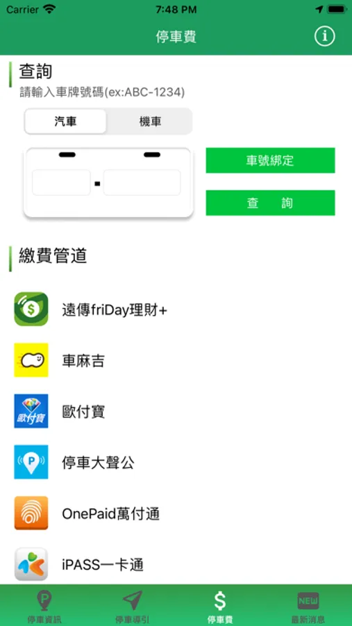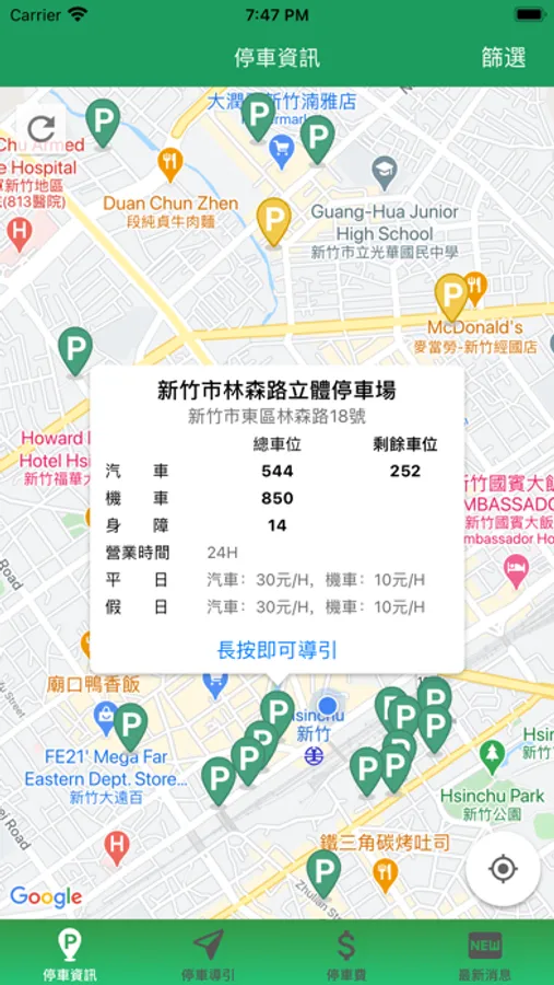 結合GPS顯示鄰近停車場之位置便於尋找停車場,可顯示停車場地址、停車格位數、剩餘停車空位數、收費方式及停車費查詢與第三方支付連結等資訊,並能自動導引停車場位置。